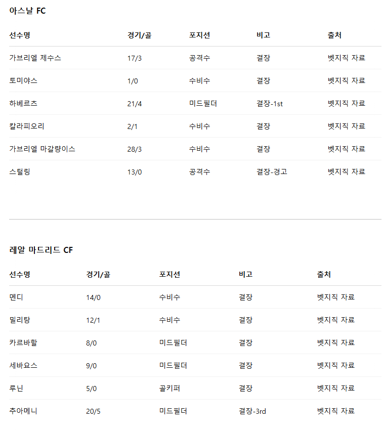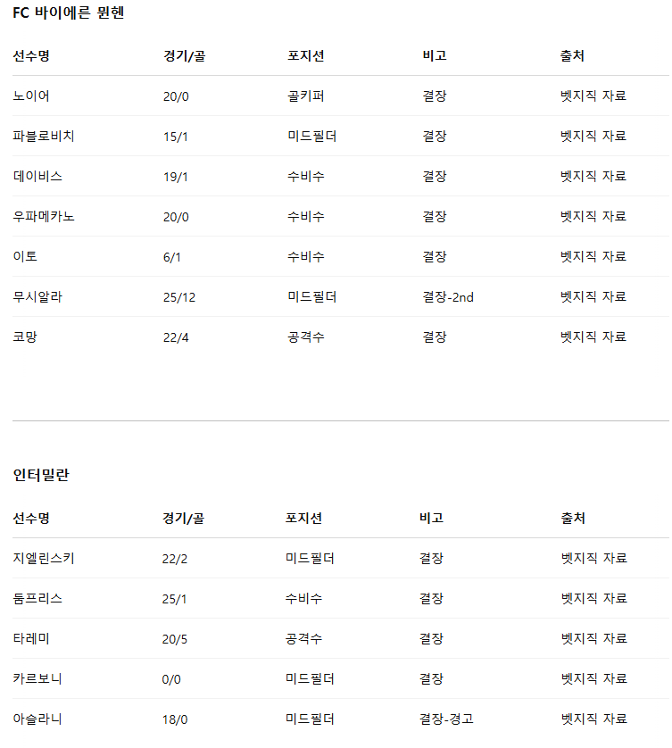 4월 1일 해외축구 결장자 및 부상자 정보 +2